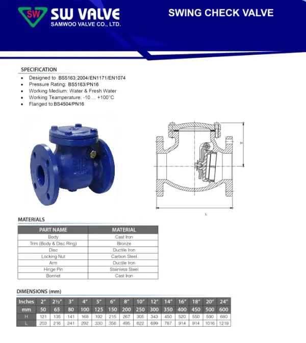 Van 1 chiều lắp bích Samwoo là thiết bị quan trọng trong hệ thống đường ống công nghiệp, có nhiệm vụ cho phép chất lỏng hoặc khí đi qua theo một chiều nhất định và ngăn không cho dòng chảy ngược trở lại. Với thiết kế hiện đại, độ bền cao và khả năng vận hành ổn định, van 1 chiều lắp bích Samwoo được ứng dụng rộng rãi trong các nhà máy nước, hệ thống xử lý nước thải, công trình cấp thoát nước và nhiều lĩnh vực kỹ thuật khác. Sản phẩm được sản xuất theo tiêu chuẩn Hàn Quốc, đảm bảo chất lượng và tuổi thọ lâu dài.