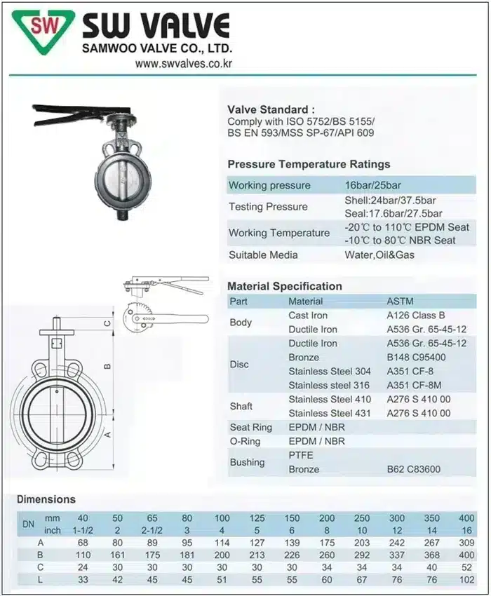 Thông số kỹ thuật của van bướm tay gạt Samwoo