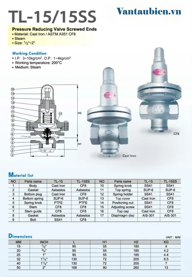 Thông số kỹ thuật van giảm áp hơi TungLung TL-15
